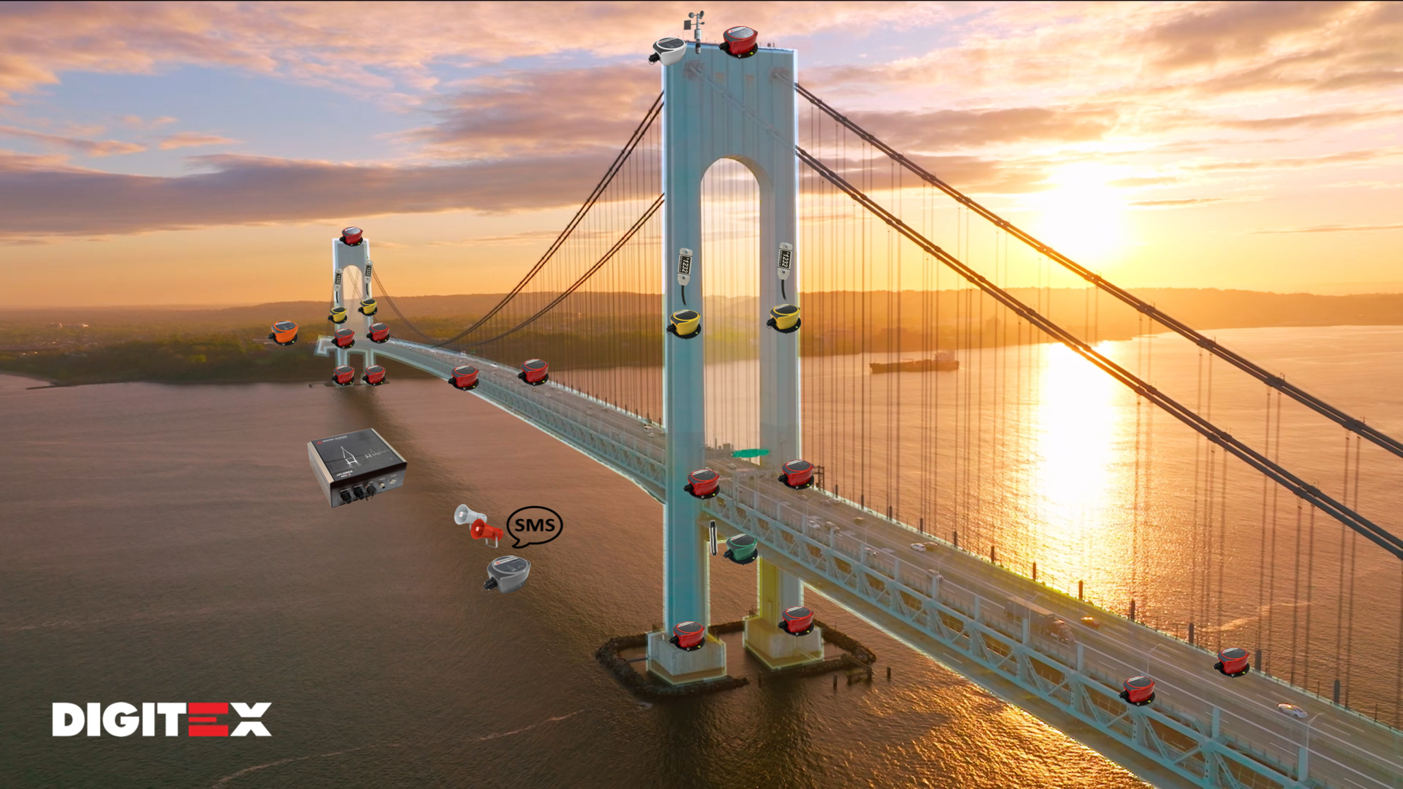 Explore how Digitex solutions seamlessly integrate into bridge infrastructure, providing continuous, real-time monitoring. Hover over or tap on each device to discover its specific role in ensuring the structural integrity and safety of bridges.